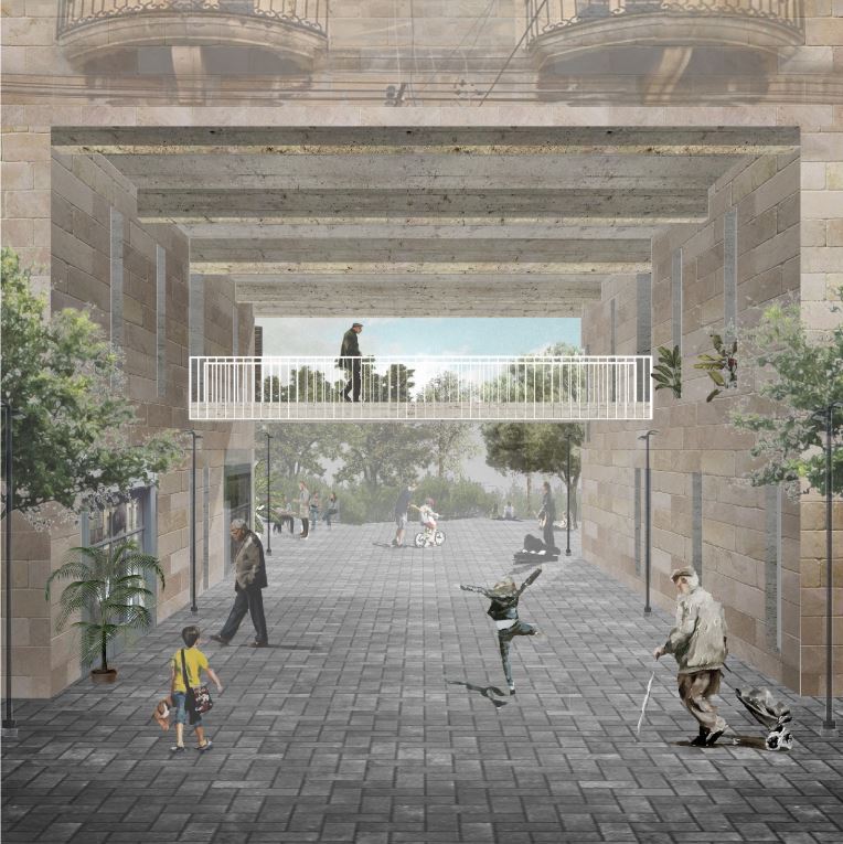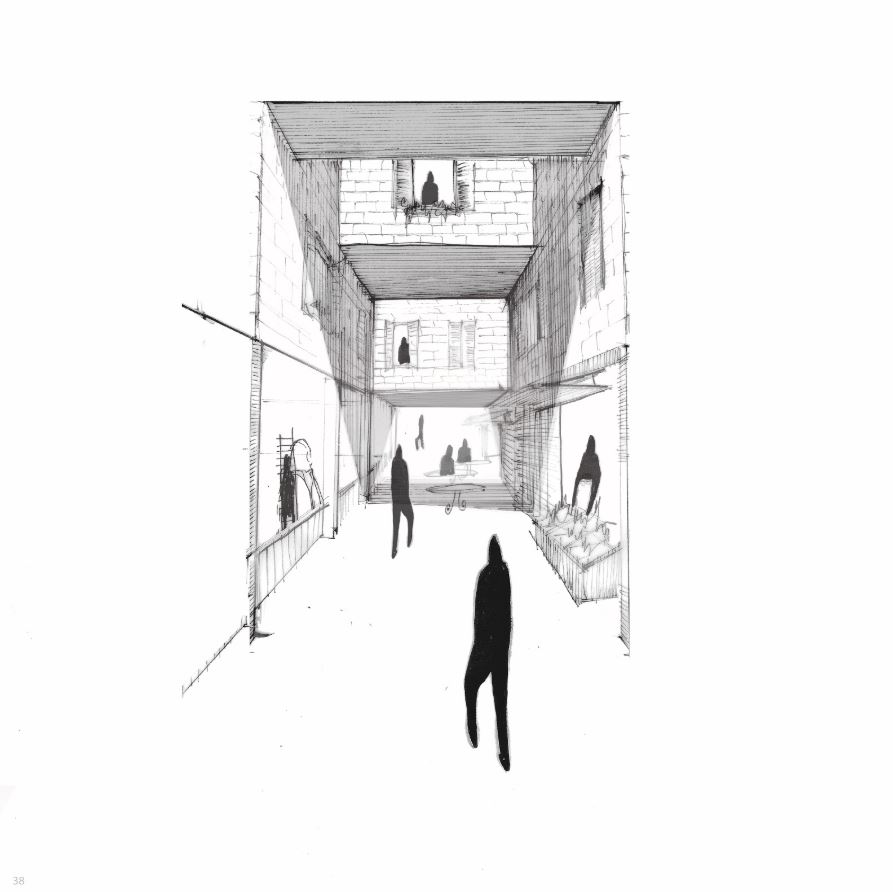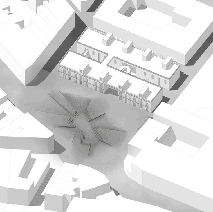 The design development started with a visibility study which took into account the team’s various projects developing on the site; it situates itself as the ‘connection’ between such projects. The space is a magnet from all visual points, and it is designed as a playful one – like a fabric which moulds to the interactions of the surrounding demographic. Aside from the piazza, the proposal expanded to include interventions on a dilapidated block which is currently only partly inhabited by three families and the police station at the edge. This block finds itself surrounded by dead frontages which are not working; a quasi no-man’s land separates it from a primary school and a grim block housing an old people’s home effectively serving as a barrier to these sites.