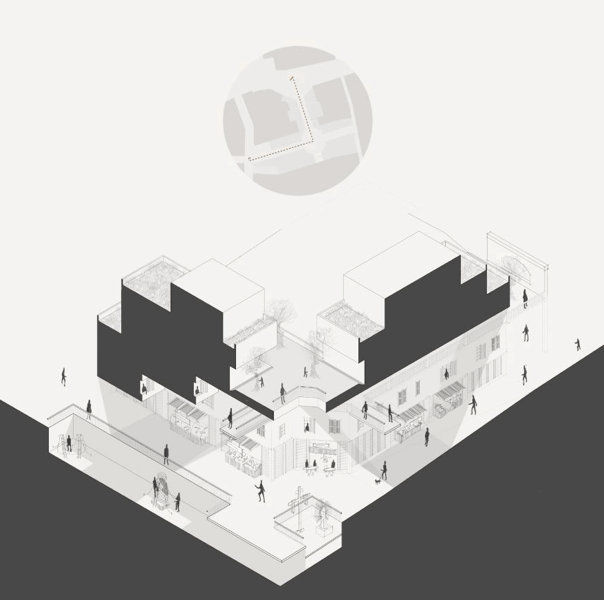 Tectonically speaking, the roof plan converges with the ground plane. Visibility from the main street is opened to the back – a perforation in the existing massing, this to reduce dead frontages. The old people’s home currently hidden from the piazza now hosts an exposed courtyard made visible from across – a silent conversation between piazza goers and inhabitants of the old people’s home.
