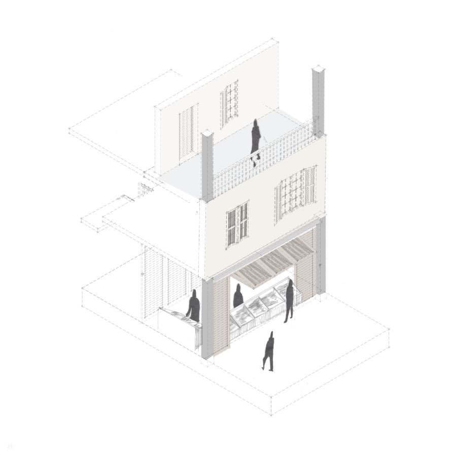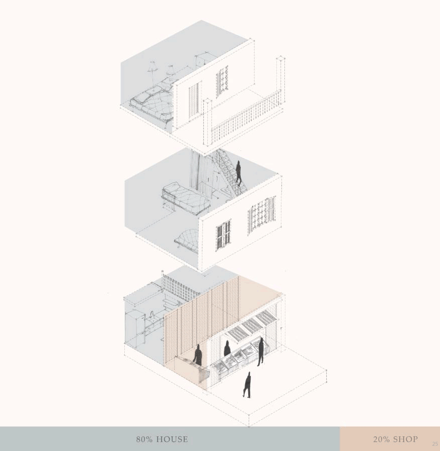 The outcome is the formation of units for multi-ethnic communities born of a commercial-residential mix. Testing various configurations aimed at incentivising residents to gain financial independence, these configurations could effectively pull people out of an economic bracket which requires a house to one which affords a house. By providing a means of income the house itself becomes an agent of change in the housing crisis. The varying mutations of shop-house collectively form a somewhat collage of cultures affording cross-integration by default of requirement of services/goods exchange.