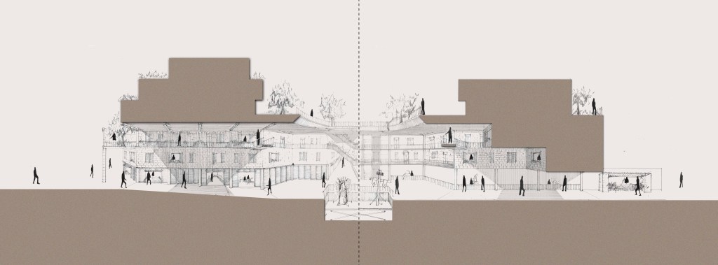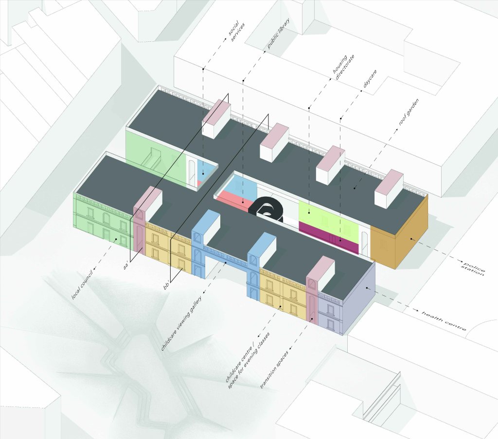 With that in mind, the goal became to introduce an intermediary street, one which cuts the dead spaces between the school and front-gates. Dissected perpendicularly to offshoot connection between the primary school and the front block – now located to be the ‘anchoring’ block. By stitching the spaces together, the entire site blends into one whole civic centre of sorts with mutual surveillance; local council, childcare centre, health care centre (rehabilitating the existing), police station, public library, housing directorate and social services centre. Newly inserted programs are arbitrary, and could assume any use or function so long as people are brought in.