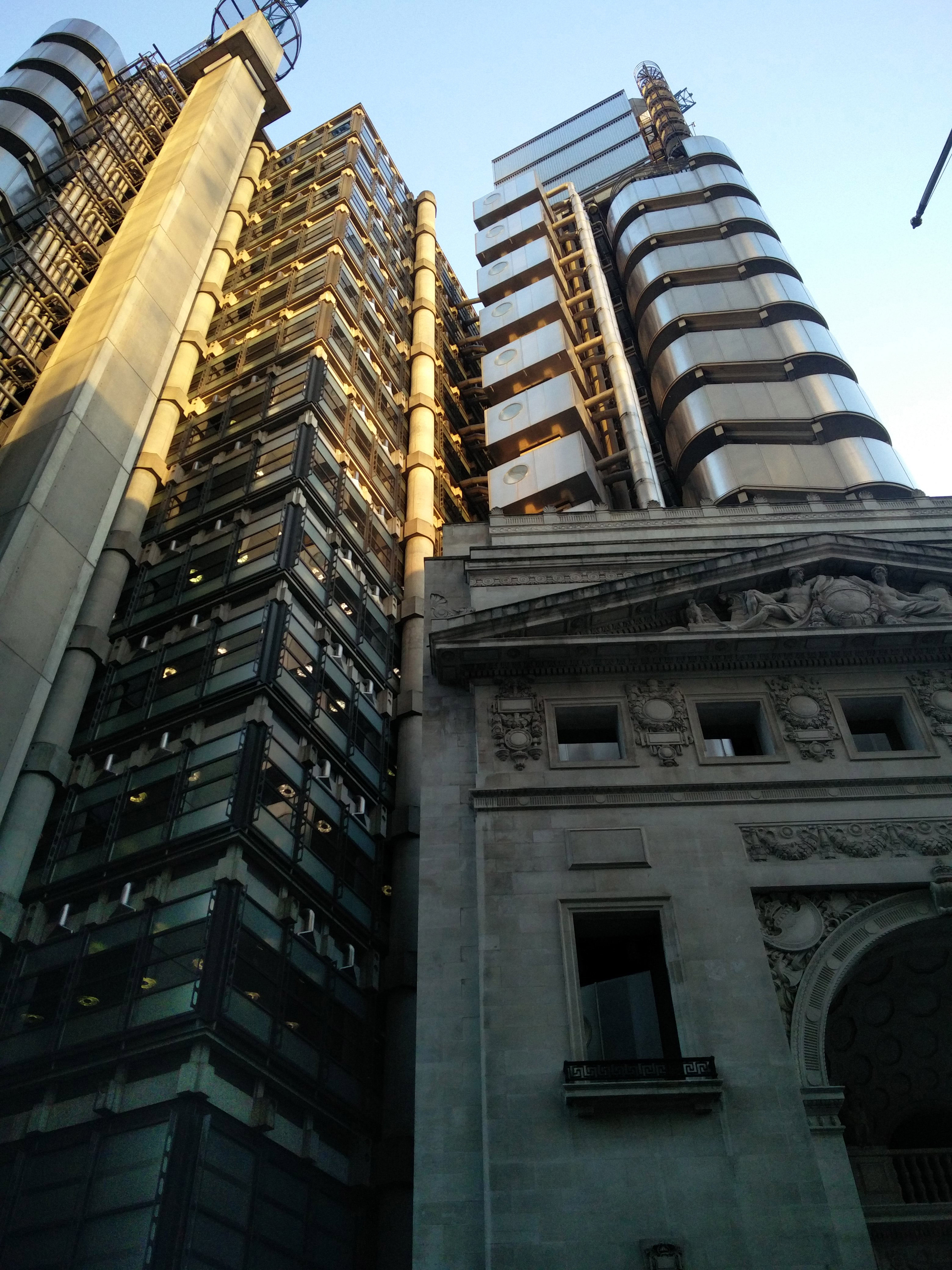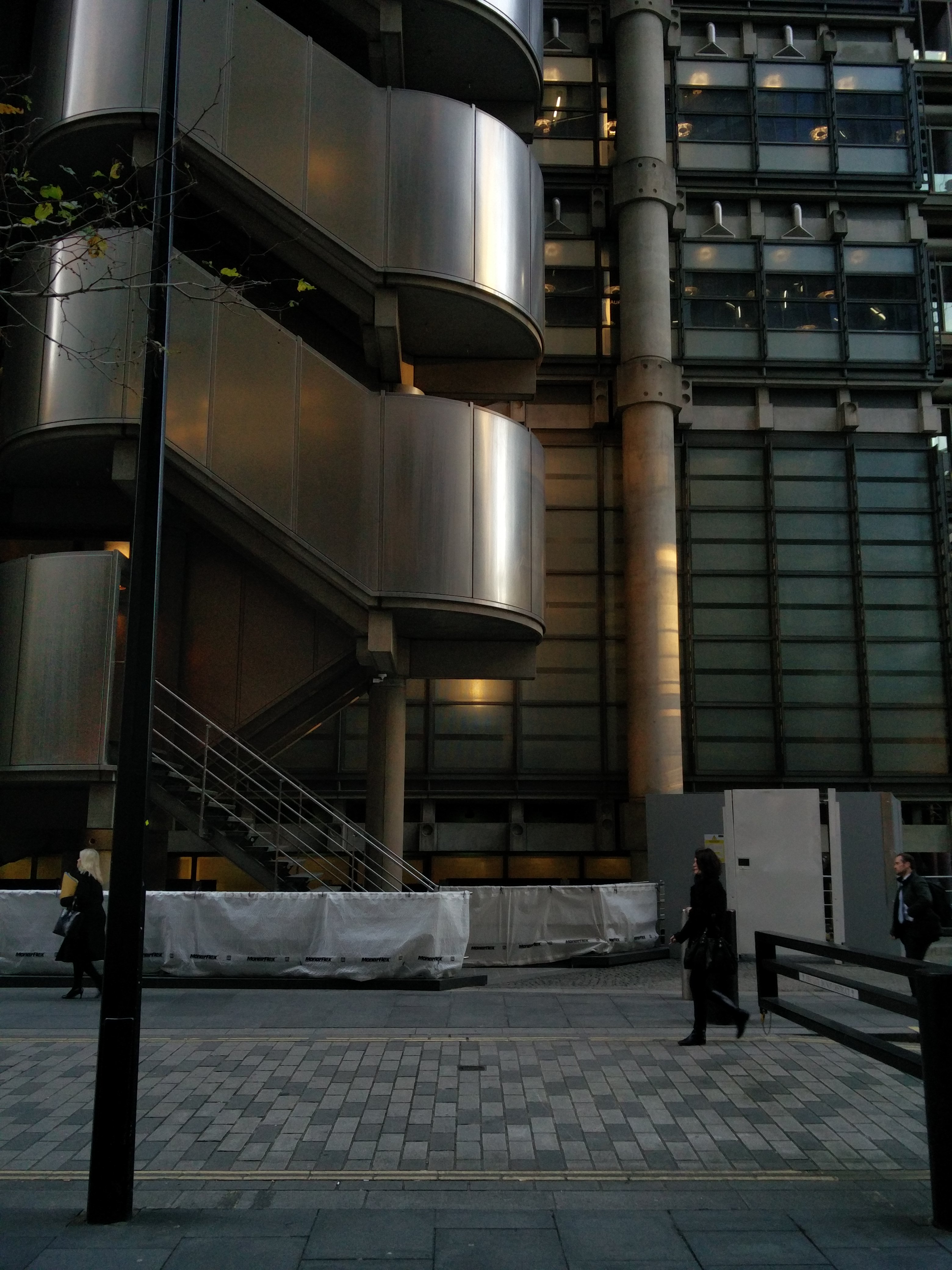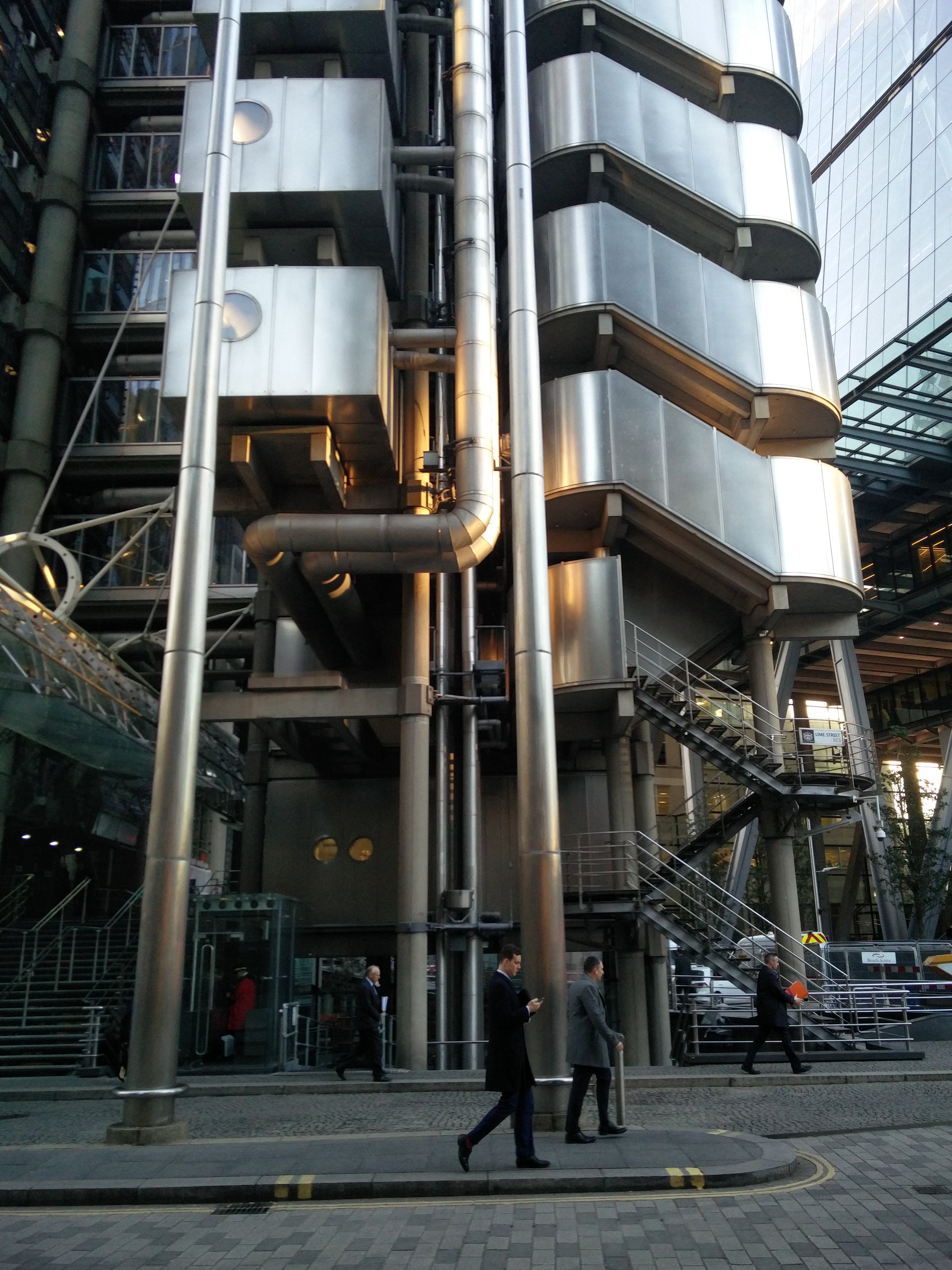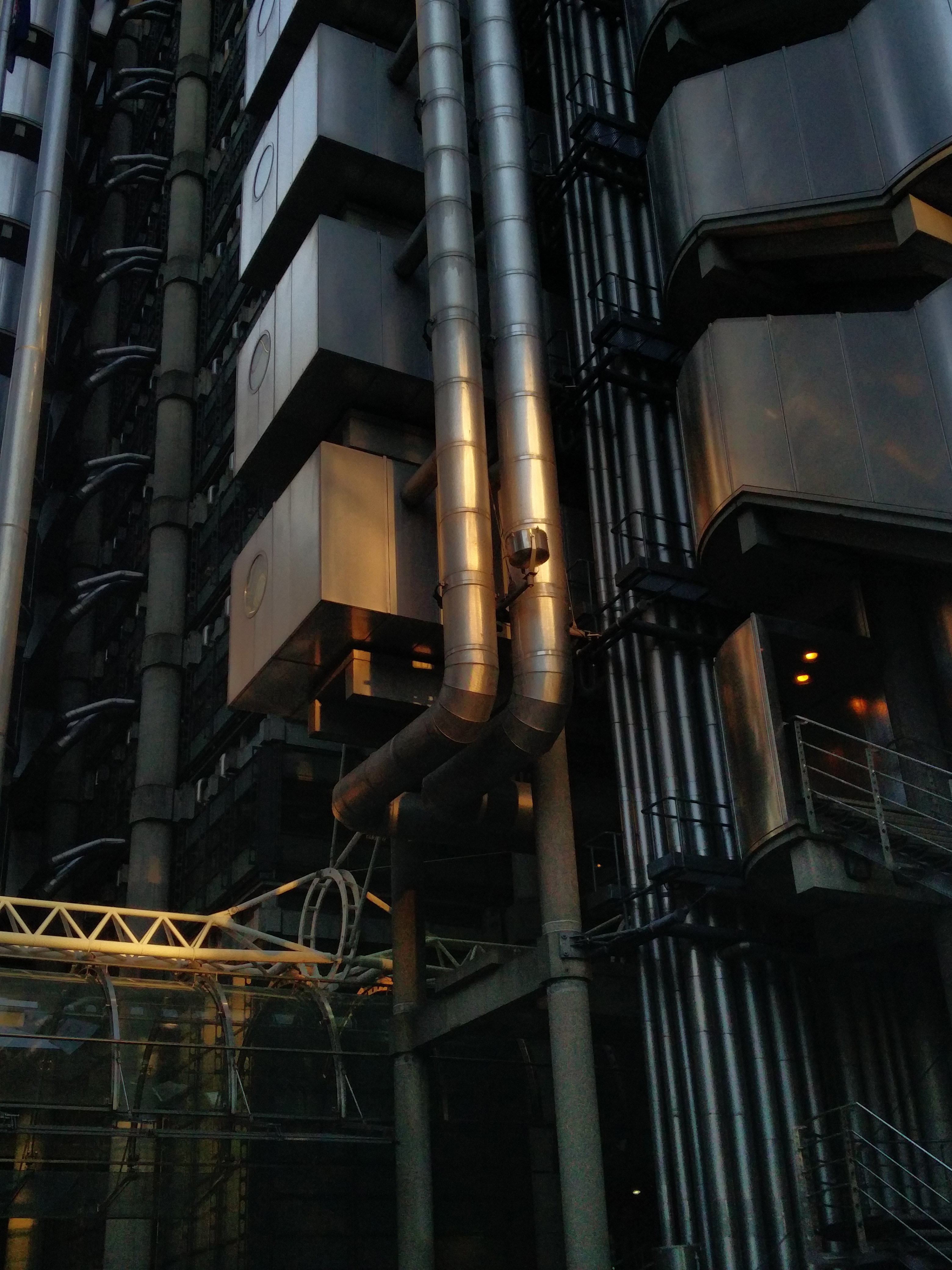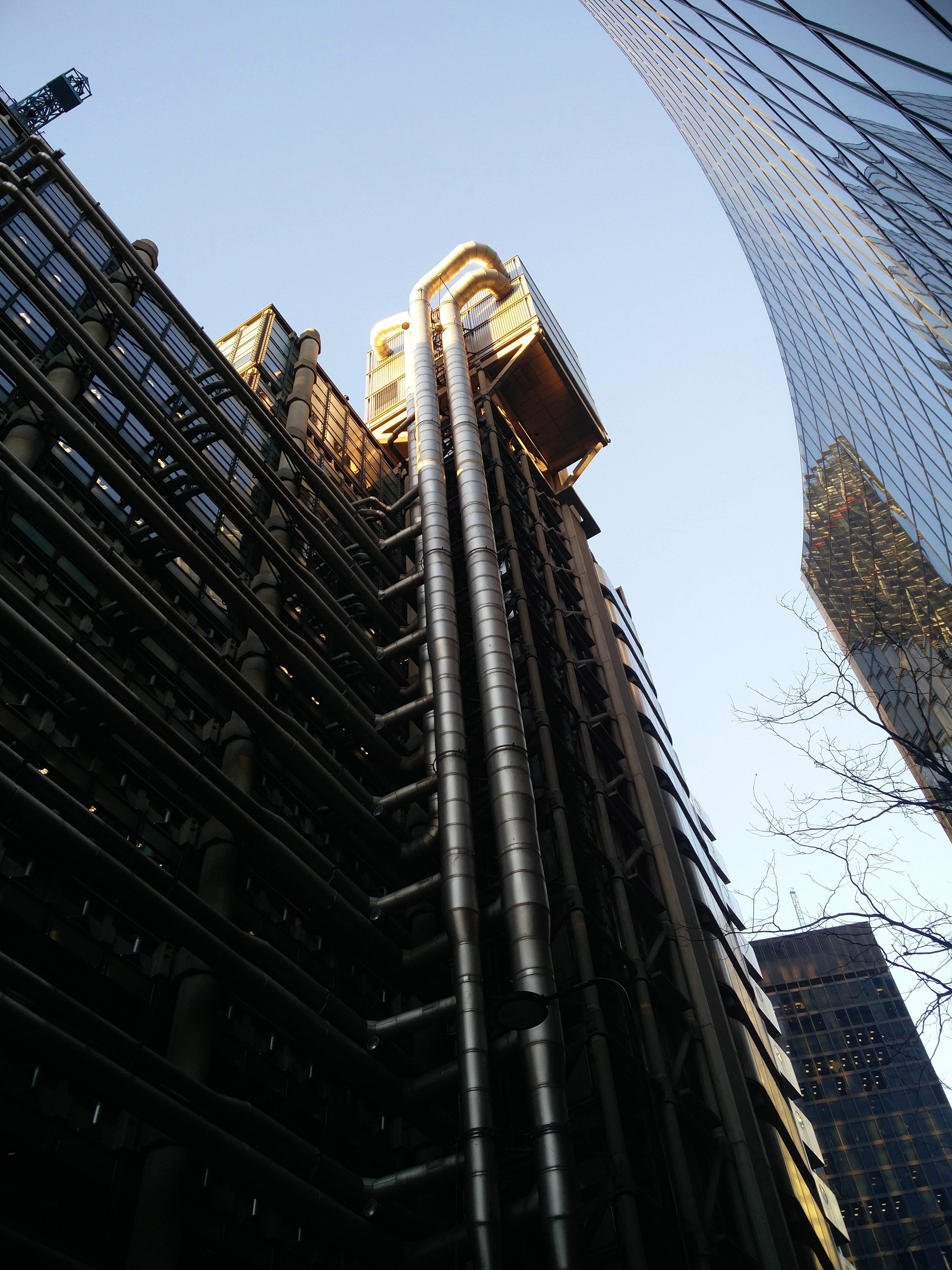 The Lloyd’s Building looks like it was imported from Japan – perhaps a long lost cousin of the Nakagin Tower. Yet, standing here amongst its taller, glass covered neighbours at central London, it smashes the predominant model of preserved Georgian-houses-turned-department-stores back-dropped by stunning glass towers, and adds a new layer in between the old and new: dirty grunge. This vulgar aesthetic is inevitable: without the lifts, stair cores and mechanical components of this building designed to be at its perimeter, dramatic aesthetic would not have been possible.