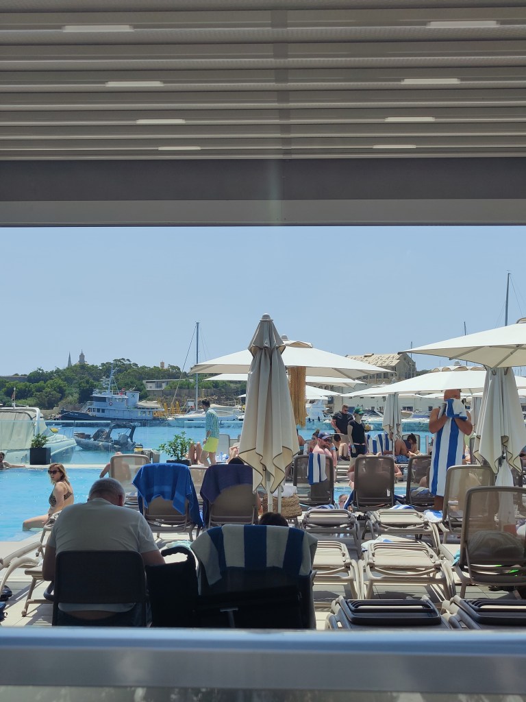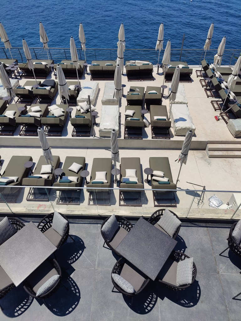 The self-referential machine is not constrained to the space of the hotel. External spaces free to the public are similarly mined and mobilised to partake in this process. Year after year shorelines become shorter as grey private lidos are cast over the public geology. Stacked one after the other, offering identical experiences of exclusive pool access and premium bars and restaurants, these typologies often spill over onto public beaches. Sunbed rental services, owned by the same lido operators target the throngs of public beach goers. An audience of sunbeds lined up row after row covering every particle of sand; it is as if even the theatre stage has been overrun by audience seating, where the audience itself becomes the spectacle to be consumed. The same can be said of the mushrooming kiosks along coastlines and in public spaces, selling beverages, food or even day trip experiences backdropped by posters of exotic palm trees and hollowed out pineapples, symbolic of an invented Mediterranean.